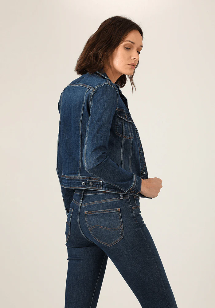 La Lee Slim Rider, la última chaqueta de mezclilla con un ajuste casi cropped muy favorecedor y auténticos detalles tipo ropa de trabajo. Ha sido confeccionada en un elegante denim azul medio desgastado, obtenido a partir de una mezcla de fibras recicladas y algodón procedente de la Better Cotton Initiative respetuosa con el medioambiente. Además, gracias a nuestra increíble tecnología de recuperación, este denim extremadamente elástico nunca perderá su forma. Cuenta con pespunte de color naranja intenso y piezas metálicas de color plata envejecido. La modelo mide 1,80 m. y está usando la talla S.