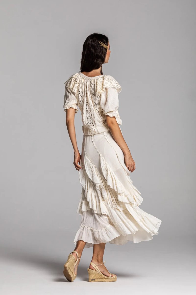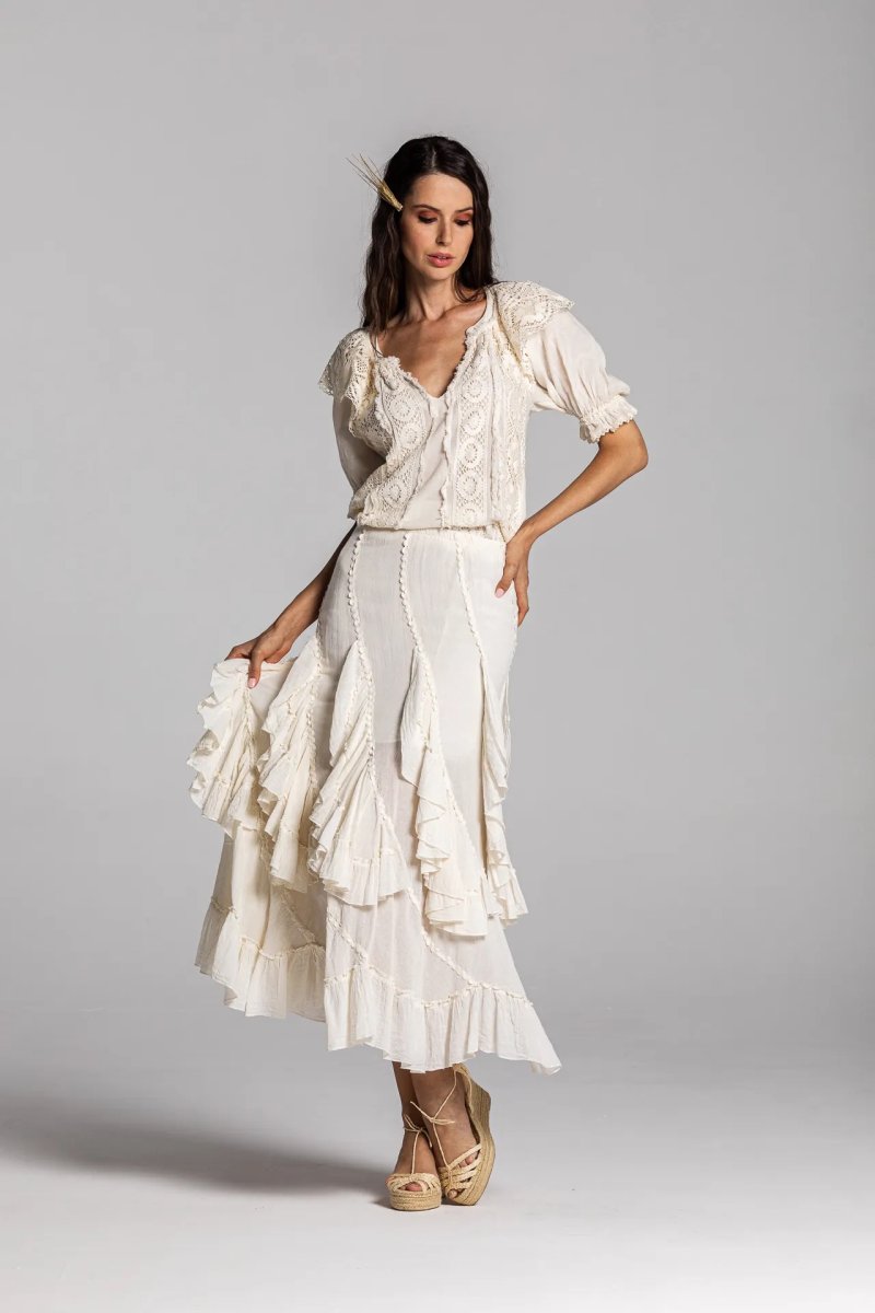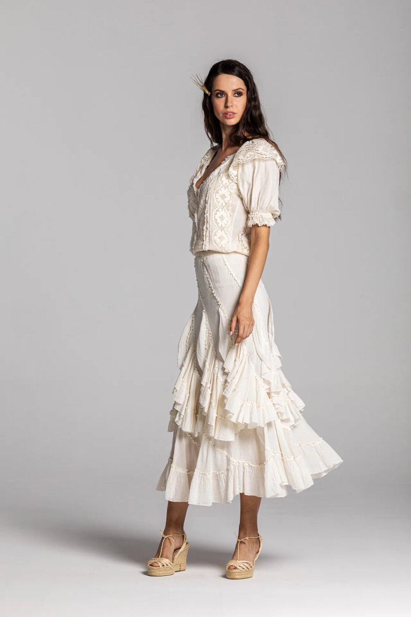 Falda de cotonet con palas circulares y volantes, adornada con godets. Color crudo.