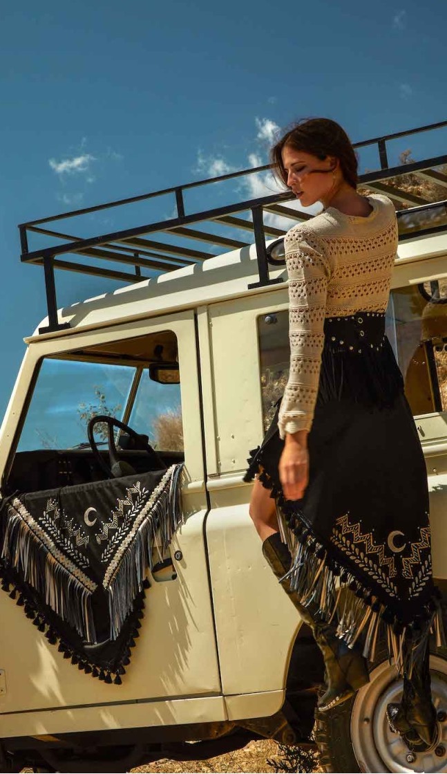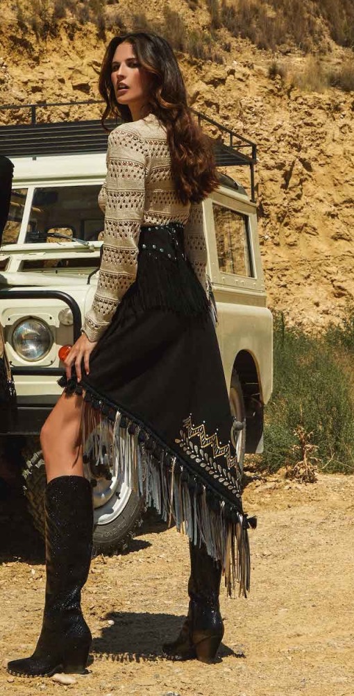 Falda de antelina de corte asimétrico decorada con flecos y pintada a mano