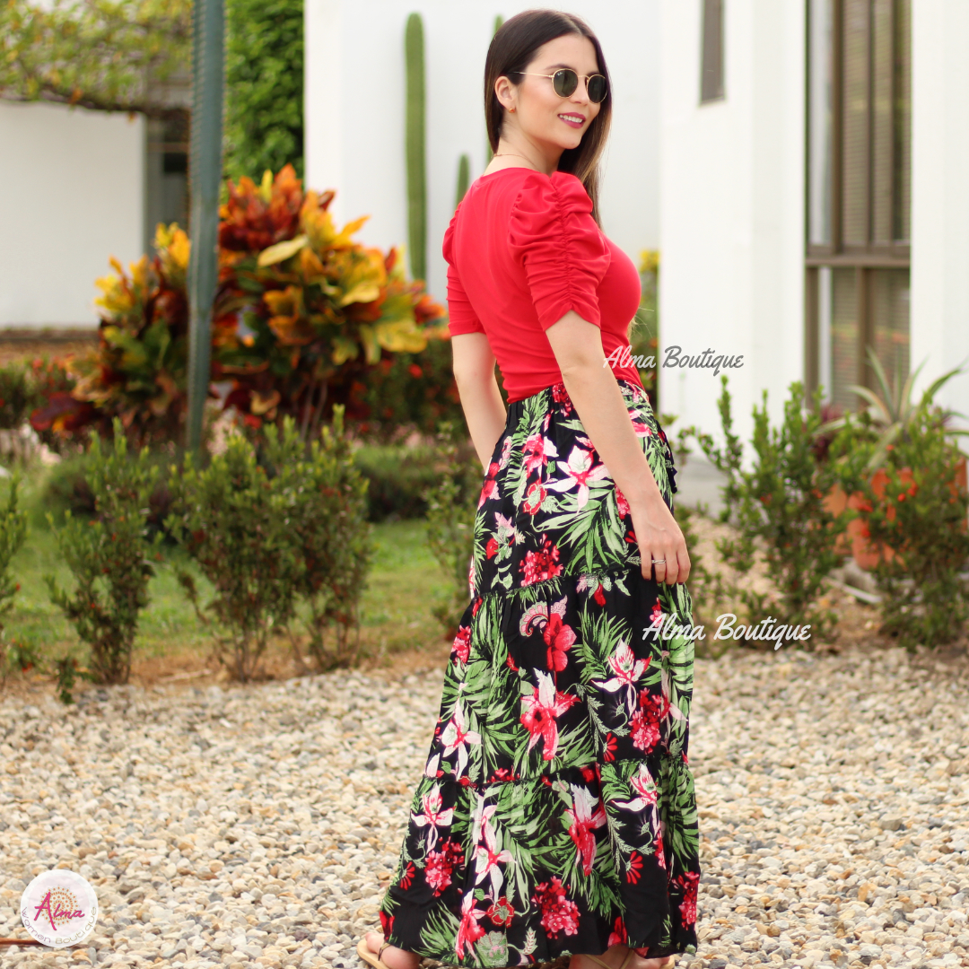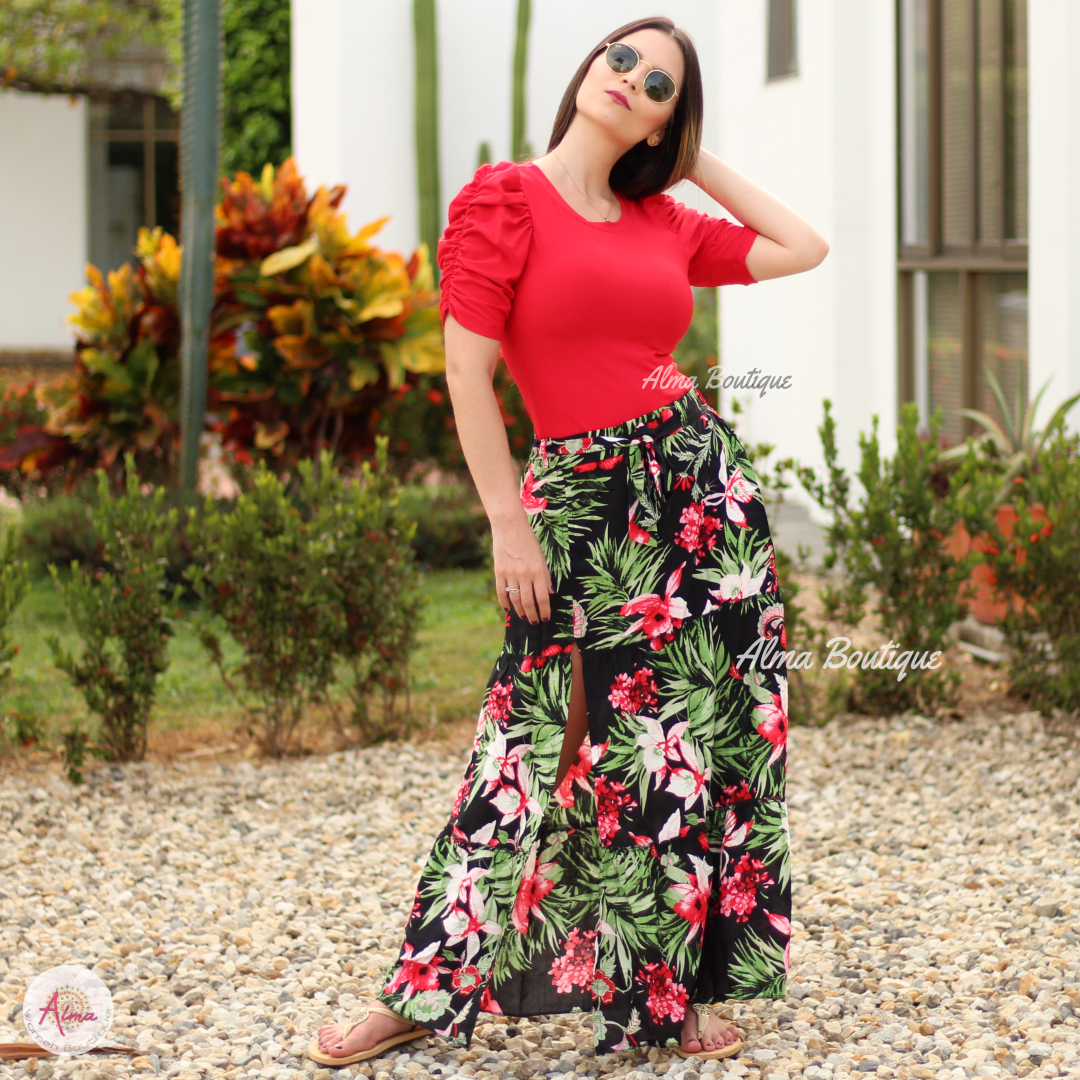 Falda Larga Flor Rojas con Abertura