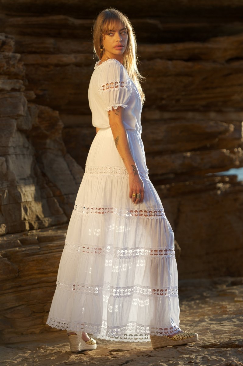 Espectacular maxi falda ibicenca de algodón decorada con puntillas y goma en la cintura.