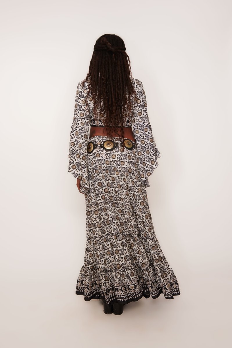Maxi falda de seda india estampada con flores con detalles en dorado.