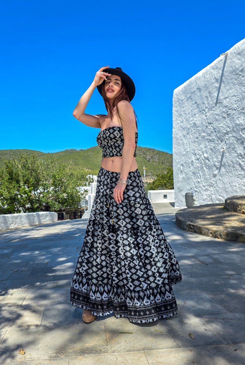 Maxi falda de seda india con print étnico en blanco y negro.