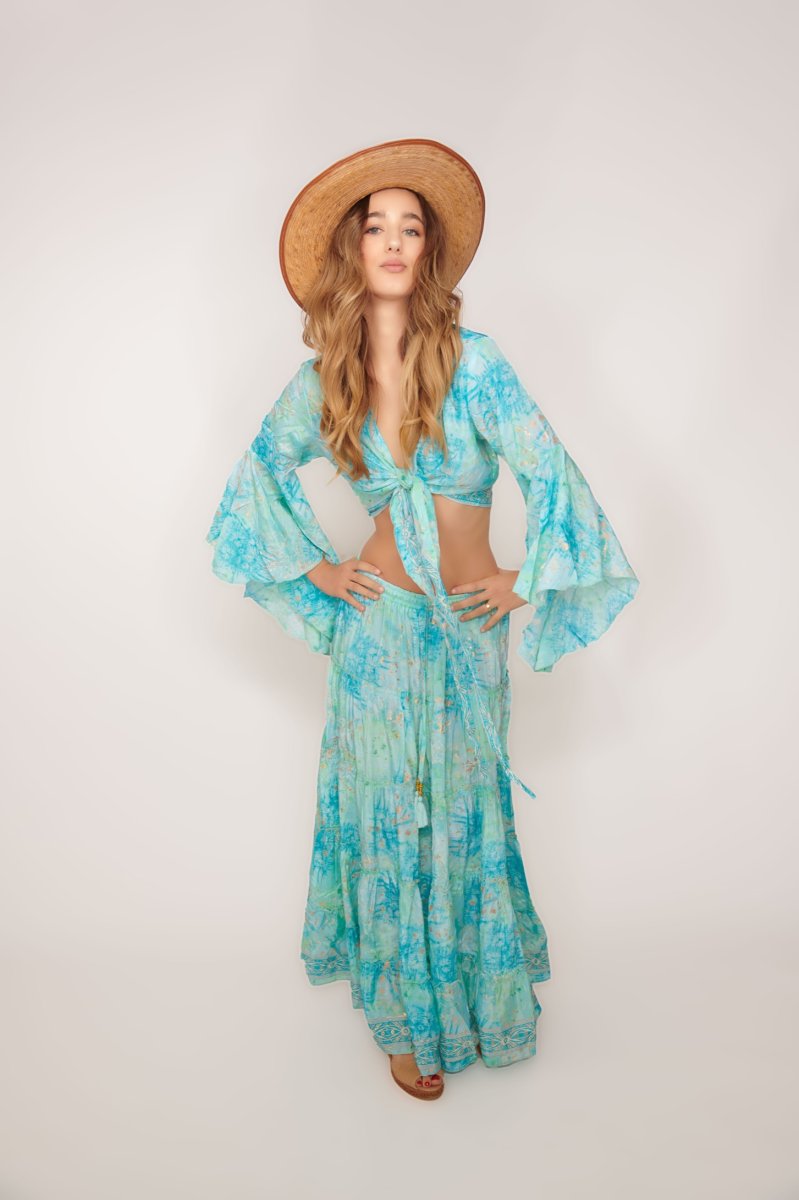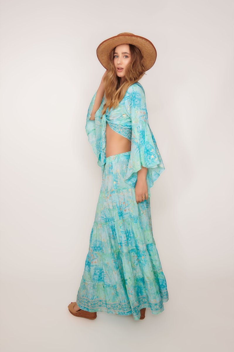 Maxi falda de seda india estampada en print de aguas azul con detalles en dorado.