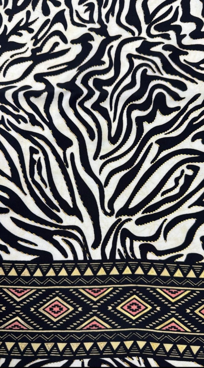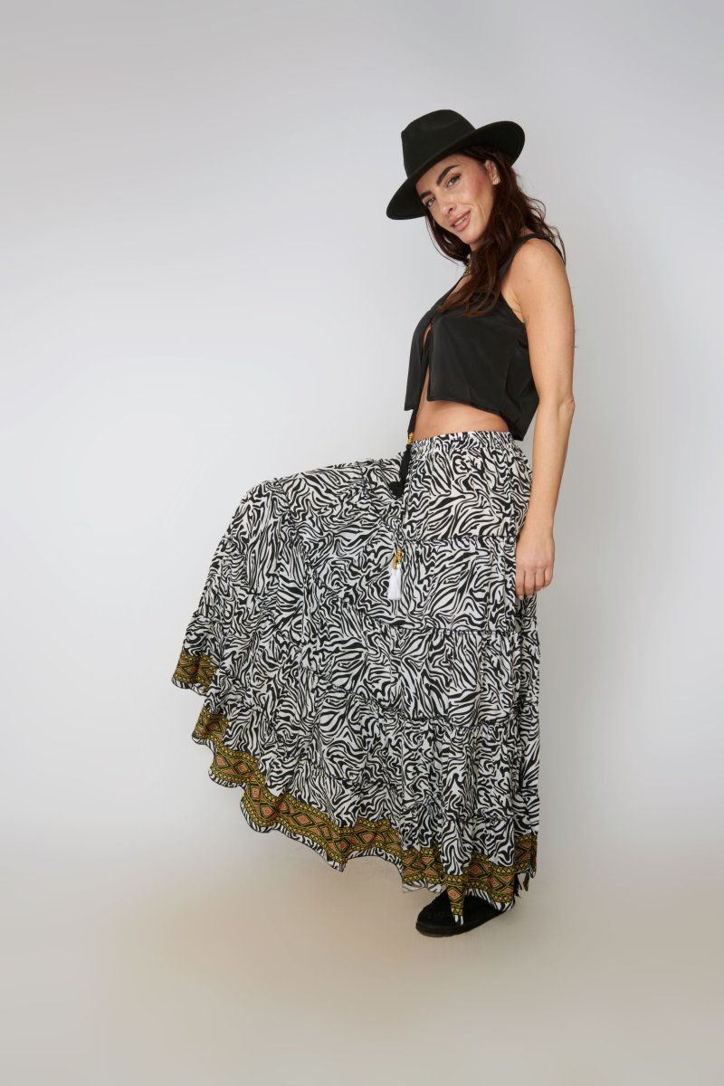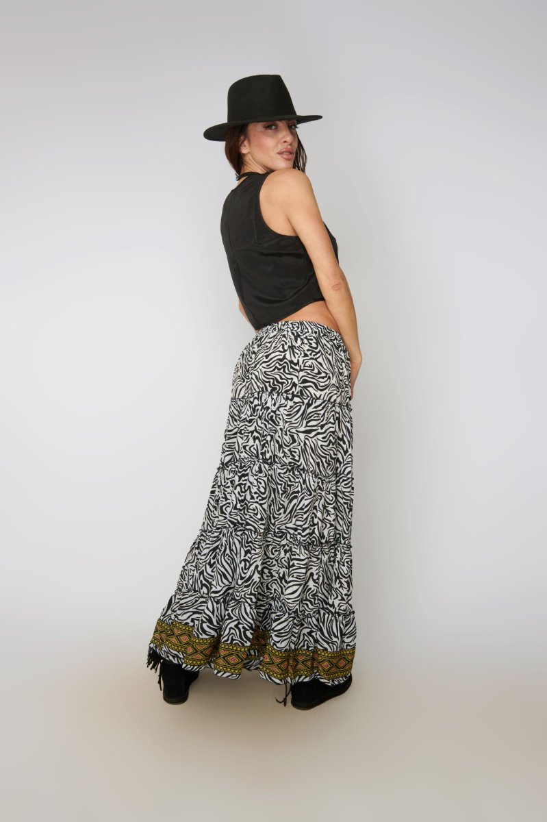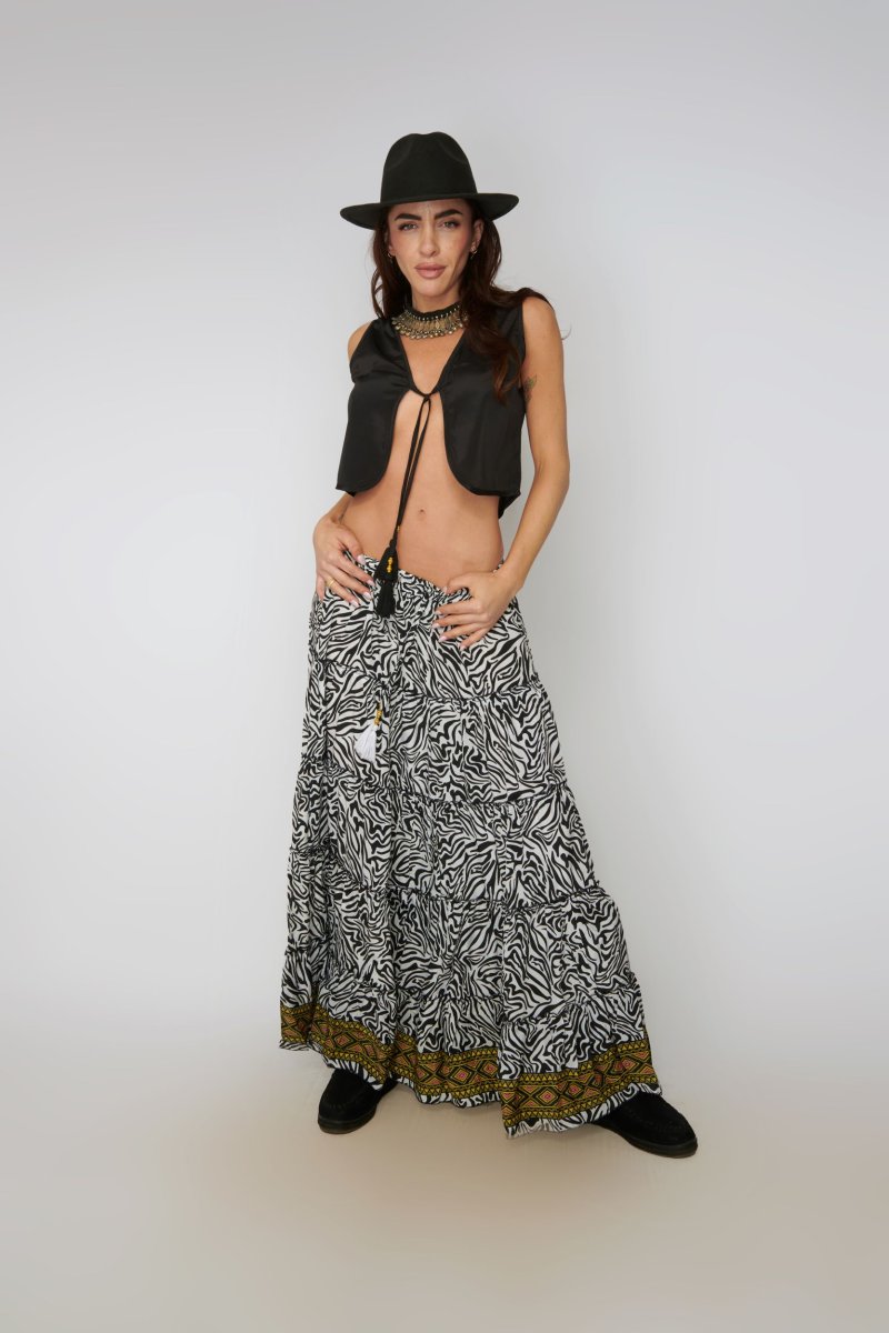 Maxi falda de seda india con print de zebra en blanco y negro.