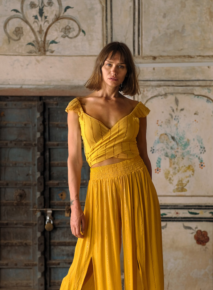 Mini top cruzado con volantes en los hombros y detalles en lurex.