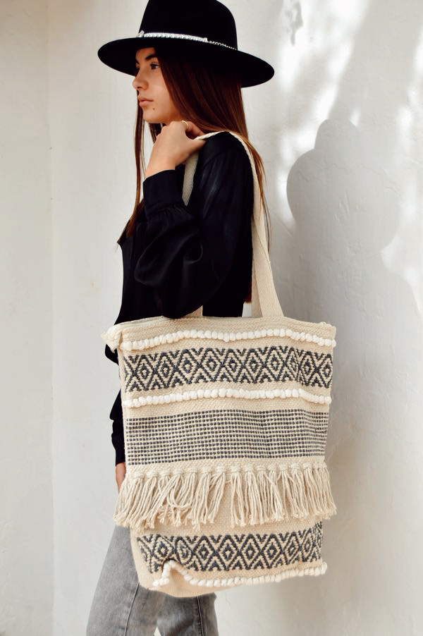 Bolso grande estilo shopping bag estilo étnico. Lleva asas y cierre de cremallera.