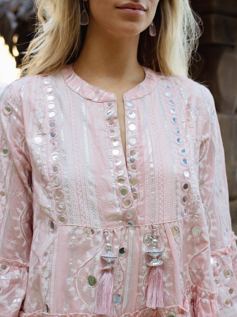 Vestido tipo túnica de algodón decorado con bordados y espejitos. Falda con volantes y detalle de borlas en el pecho.