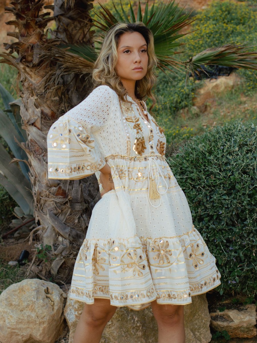 Vestido tipo túnica de algodón decorado con bordados y espejitos. Falda con volantes y detalle de borlas en el pecho.