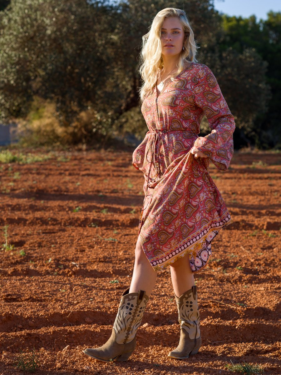 Vestido largo abotonado, cintura ajustable y escote de pico.